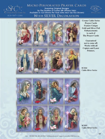CROMO N.B. Instructions for use and preparation of Religious Ceremonial greeting cards: 1) Load card sheets in printer tray. 2) Transfer deceased information on the template or incorporate into your computer program. CALDO SILVER SERIES 3) Check first copy to insure correct alignment. 4) Make desired number of cards. 5) Fold cards two 8 UP times - to the front / then the back and separate cards. 6) Save template / computer information and include 8-CSS5 © CR