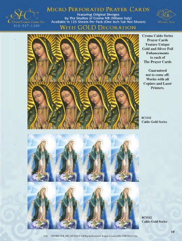 CROMO N.B. Instructions for use and preparation of Religious Ceremonial greeting cards: 1) Load card sheets in  printer tray. 2) Transfer deceased information on the template or incorporate into your computer program.  CALDO GOLD SERIES 3) Check first copy to insure correct alignment. 4) Make desired number of cards. 5) Fold cards two   8 UP times - to the front / then the back and separate cards. 6) Save template / computer information and include   8-CO12   © CROM